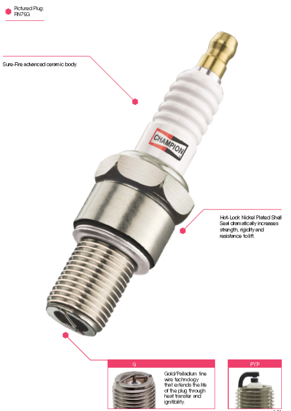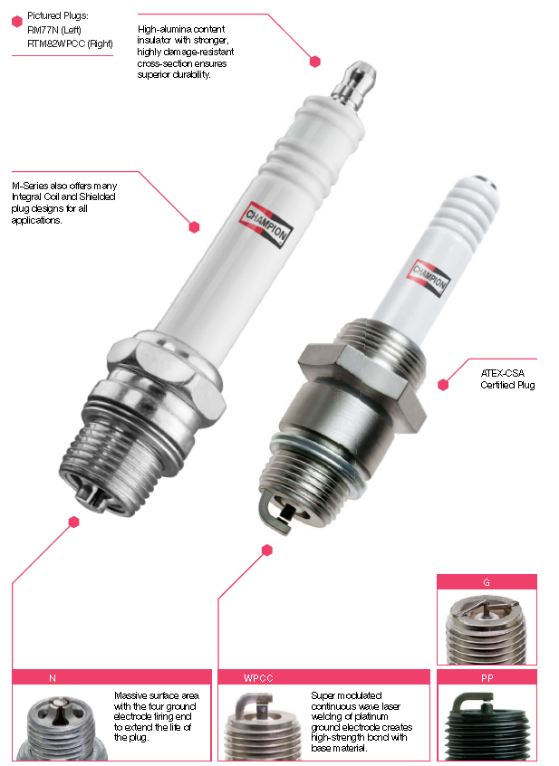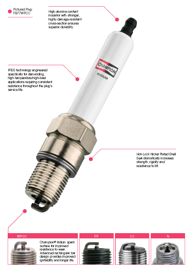 Las bujías industriales Champion® están diseñadas con metales preciosos, tecnología de resistencias F.I.S.S y Hot Lock.