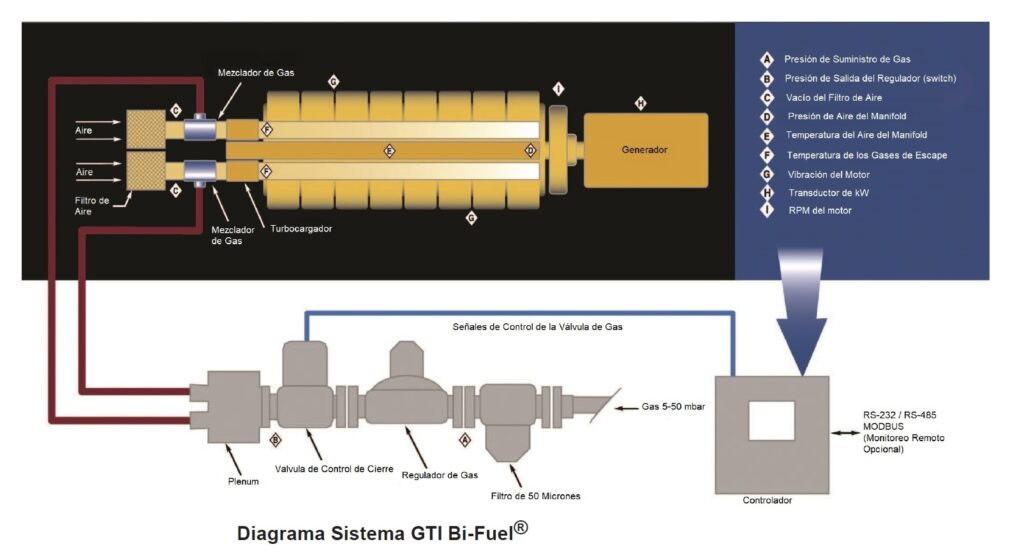 El sistema GTI Bi-Fuel® funciona mezclando diesel y gas natural en la cámara de combustión. Esto se consigue mediante un diseño de carga de gas fumigado, en el que el gas natural se mezcla previamente con el aire de admisión del motor y se introduce en la cámara de combustión a través de la válvula de admisión de aire. La mezcla de aire y gas se enciende cuando el inyector rocía una cantidad reducida de diesel en la cámara. Este “piloto” de diesel actúa como fuente de ignición de la mezcla combustible primaria de aire y gas. Dado que el sistema Bi-Fuel utiliza los sistemas OEM de admisión de aire e inyección diesel, no se requieren modificaciones internas del motor para su instalación.