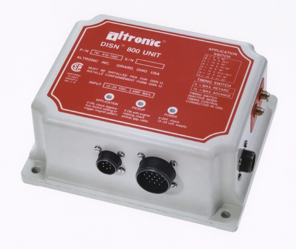 El Altronic DISN 800 es un sistema de ignición digital basado en microcircuitos, alimentado por 12-24 VCC, aplicable a motores de gas estacionarios pequeños y medianos. Estos sistemas, que se ofrecen en versiones de 8, 12 y 16 salidas, eliminan las partes móviles y brindan una alta precisión y estabilidad de sincronización al eliminar los engranajes y acoplamientos de transmisión magnética.